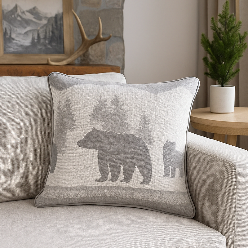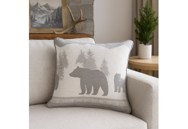 Thème montagne pour le coussin CANADA GRIS qui arbore un motif sur sa face principale (soit un gros ours au centre soit des carreaux surplombés de petits ours, en fonction des stocks disponibles. Son autre face est unie pour plus de sobriété. Les couleurs passe partout de ce coussin CANADA participent à le rendre chaleureux.
