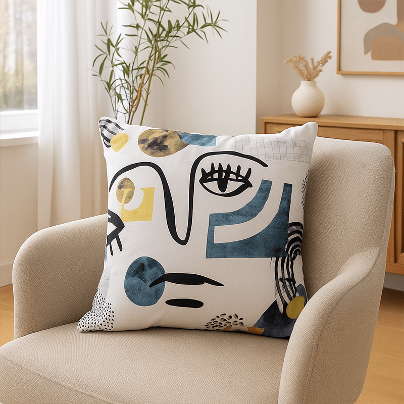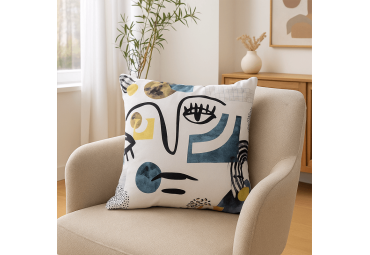 Le coussin visage ligne bleu et jaune est né d'une confection 100% "Made in Mousse et Coussins" et 100% Française.