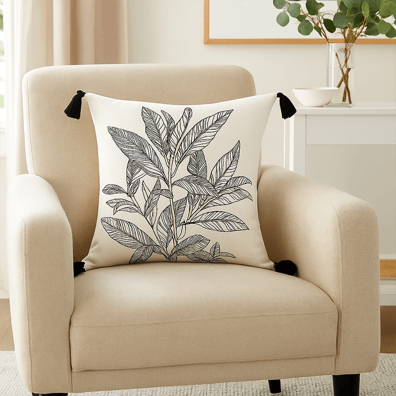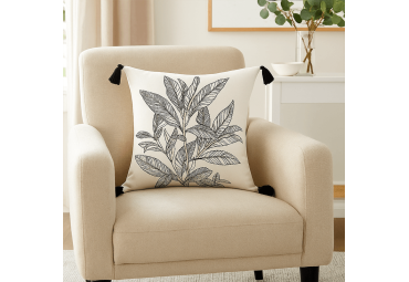 Le coussin Kinogi noir, de dimensions 40x40 cm, présente des motifs de feuilles noires sur fond blanc, créant un contraste moderne et épuré. Idéal pour enrichir votre décoration intérieure avec une touche sophistiquée, il est agrémenté de pompons à chaque coin, ajoutant un détail raffiné et unique.