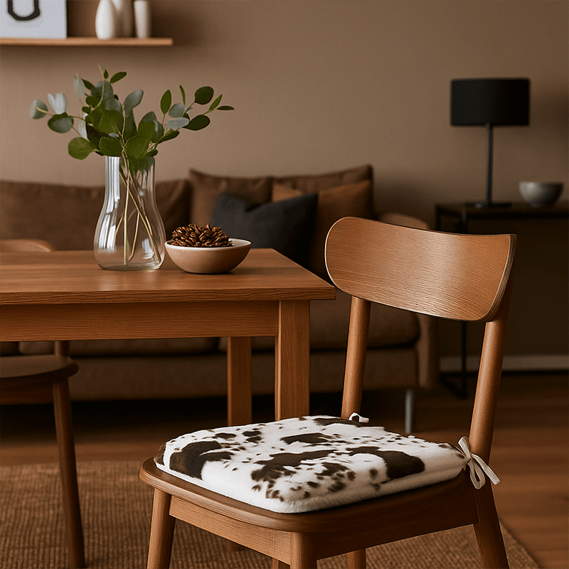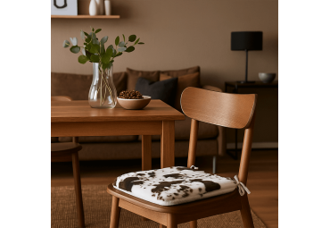 La galette de chaise Vache brun, de dimensions 38x38 cm et d'une épaisseur de 4 cm, présente un dessus effet peau de vache très doux et un dessous blanc. Dotée de lacettes de fixation à l'arrière, elle ajoute une touche rustique et chaleureuse, parfaite pour créer une ambiance campagnarde authentique.